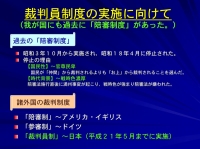 ○ 戦前の昭和3年(1928年)から昭和18年(1943年)までの15年間,殺人,放火,強盗傷人など重罪の刑事裁判で陪審制度(12人の陪審員のみで有罪か無罪かを決める)が行われていた。全国で合計484件が陪審の評議に付され,うち80件が無罪。因みに広島では10件中1件が無罪,仙台では16件中9件が無罪。平成21年(2009年)5月までに裁判員制度(6人の裁判員が裁判官と協同して,有罪か無罪かを決め,有罪の場合は量刑を決める)が実施される予定。