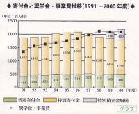 1991~2000年までの寄付金の推移ですが、順調に推移していたようですが、特別寄付金が減ってきて、積み立て基金の取り崩しや、奨学生の人数も金額も減少していきます。