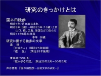 研究の結果としては、独歩は武士の家庭で育てられ、子供時代からも「立身出世」の願望が強い人物でした、青年になってから吉田松陰に夢中になり、そして吉田松陰を真似て、いろいろなことをやっていました。彼が16歳から亡くなるまでの22年間、彼の社会における様々な行動から見れば、真に王陽明の「知行(ちこう)合一(ごういつ)」を当時の社会へ実践していったといえます。こういう風に考えると、やはり、独歩の人生に強く影響を与えたのは、老荘ではなく孔子の代表とする儒教思想であることがわかってきます。