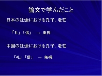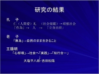 今回研究を通して、中国の伝統的な孔子、老荘などの思想を根本的に読むことができ、大変よかったと思っています。私の生まれた時代はちょうど中国の文化大革命の後期で、孔子、老荘などを強く批判する時代であり、その中において私のような世代が基本的な孔子、老荘の思想に触れることができませんでした。日本に来て日本人の礼儀、日本人の考え方、日本人の思いやり、日本人の自由な暮らしなどが私を魅力させました、それは真に孔子、老荘らの教えが日本社会での開花した結果であると思います。