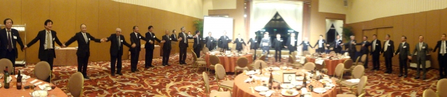 例会終了後、親睦砂田副委員長の進行で、歓迎会がはじまった。新会員歓迎会として数年前は色々と趣向を凝らした時期もあったようだが、最近はカラオケ。新会員が歌い、長老、次年度会長と続き熊野君の歌で締めくくり、全員で「手に手つないで」でお開き。「穂」経由のマイクロバスで帰路についた。