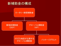 新地区補助金は、一括して地区に支給され、地区財団活動資金の50%まで使用することが出来ます。新地区補助金は、2年以内の短期間のプロジェクト、簡素、柔軟、革新的使命に沿った教育的・人道的プロジェクト活動(柔軟性)、比較的小さな活動やプロジェクト(継続性)、指針に幅を持たせ、地元が決定権を持つ(自主性)などが要求されます。