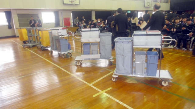 2月21日(火曜日)午後12時30分より広島市立広島特別支援学校に於いて、PTA会長中島恵様、校長中尾秀行様並びに小中高の教頭先生に列席していただき、クラブ会員34名が出席しクラブの例会を行った。校長先生より特別支援学校の概略並びに学校の活動の説明があった。特に高校生が卒業して就労のための検定試験などに力を注いでおり、ロータリークラブの今回の寄贈は、学校、学生にとって大変感謝をしているとのことであった。午後1時からは、学校の体育館で、就業訓練のための清掃用カート贈呈式が、広島市教育委員会事務局学校教育部特別支援教育課、課長島筒篤様 、 指導主事大久保誠様、学校PTA会長、校長ならびに教職員さらに1年から3年生の全高校生、広島中央ロータリー会員出席のもと、執り行われた。贈呈式での学生代表の生徒会長さんのお礼は、たいへん感動的で、私の隣で前原さんが泣いていました。