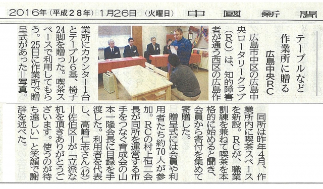 奉仕プロジェクト委員会、人間尊重・社会奉仕[山本委員長]は、第1694回例会を、広島作業所訪問例会とし、社会福祉法人広島作業所へ、喫茶用カウンター、テープル・椅子を寄贈した。参加した会員と広島市など関係者と、作業を見学し交流会に参加した。